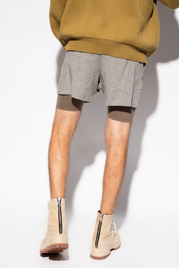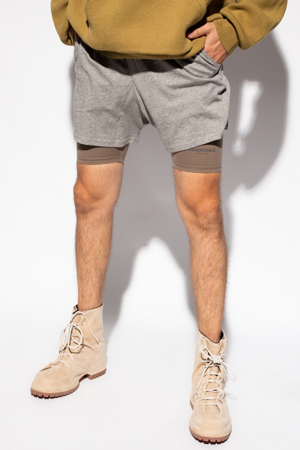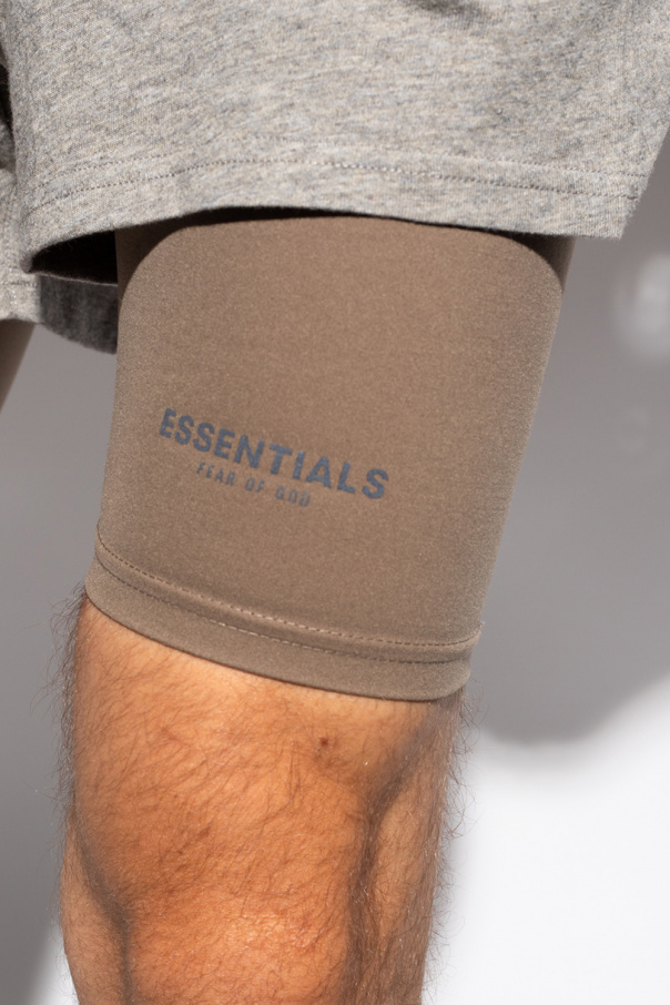 Short brown leggings from Fear Of God Essentials. Decorated with a reflective logo print, this pair is complete with a black elastic waistband embroidered with a grey logo.