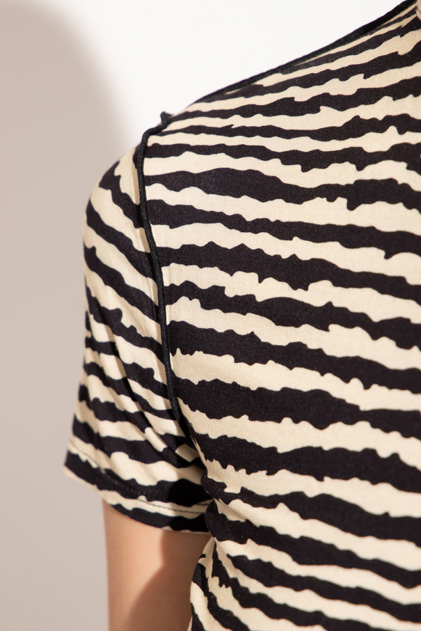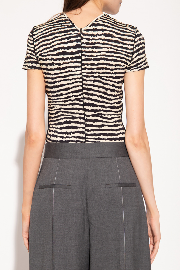 Cream and black top from Proenza Schouler White Label. This short sleeve design features an animal pattern, decorative stitching and ribbed crew neck.