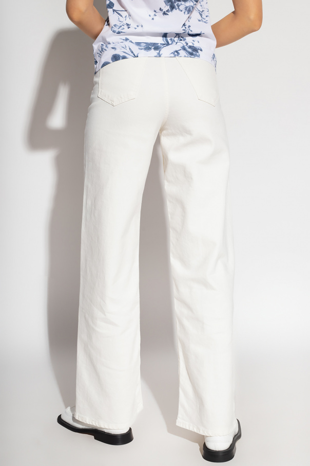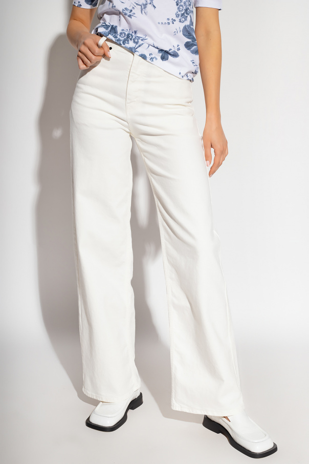 White jeans from BITE STUDIOS. Crafted from organic cotton with a high-waisted silhouette, this pair falls with wide, straight legs and features a zip fly with a button, four slip pockets and an embroidered logo on the front.