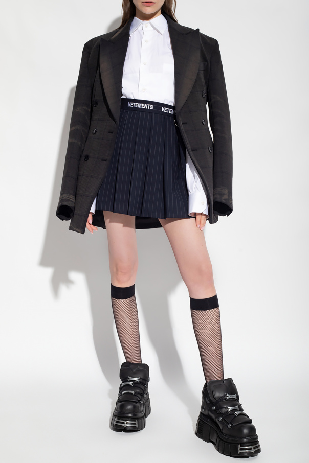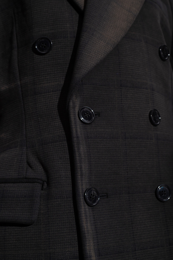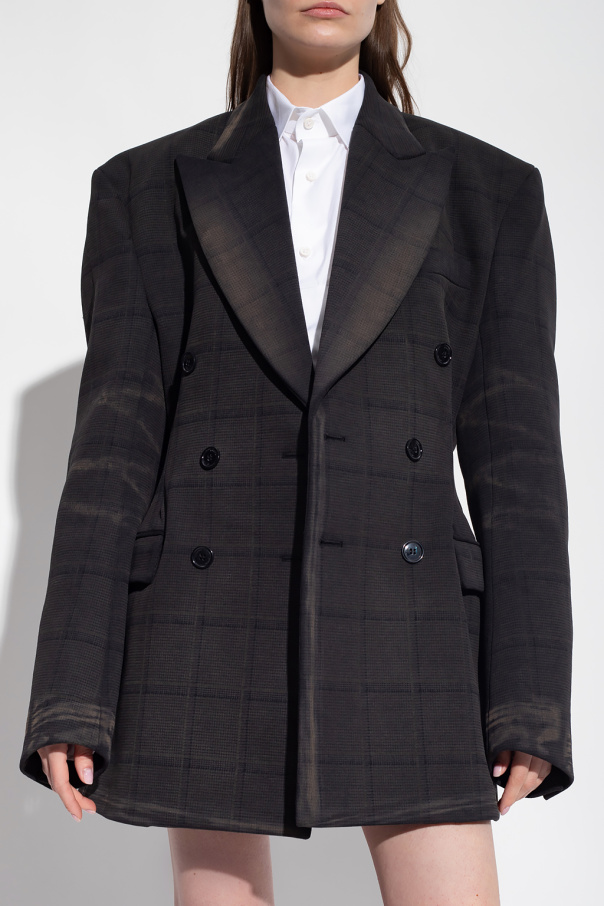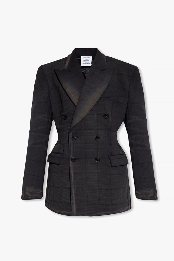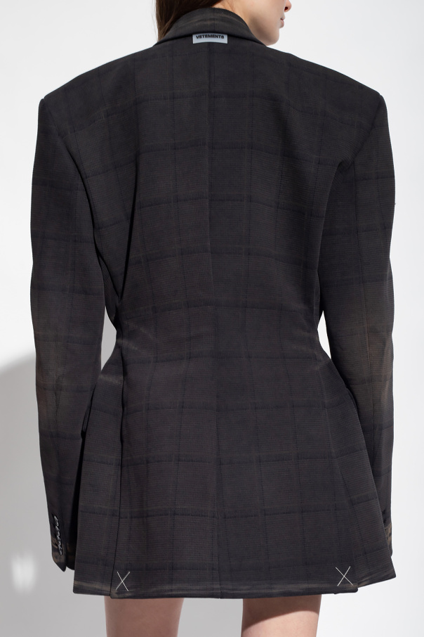Black and beige double-breasted blazer with peak lapels from VETEMENTS. Made of cotton, this loose-fitting design features button fastenings, check pattern, two flap pockets, one slip pocket, long sleeves, double rear vent and rubber logo patch at the back.