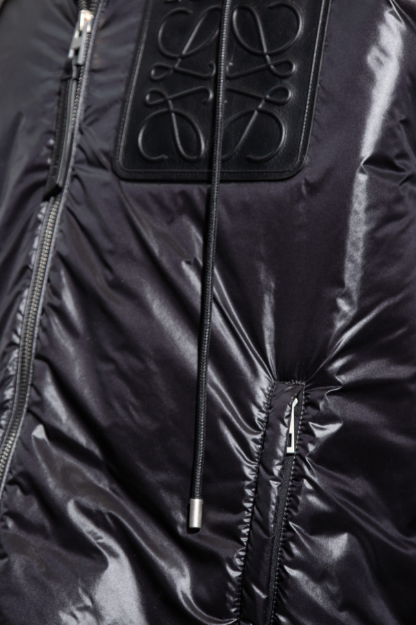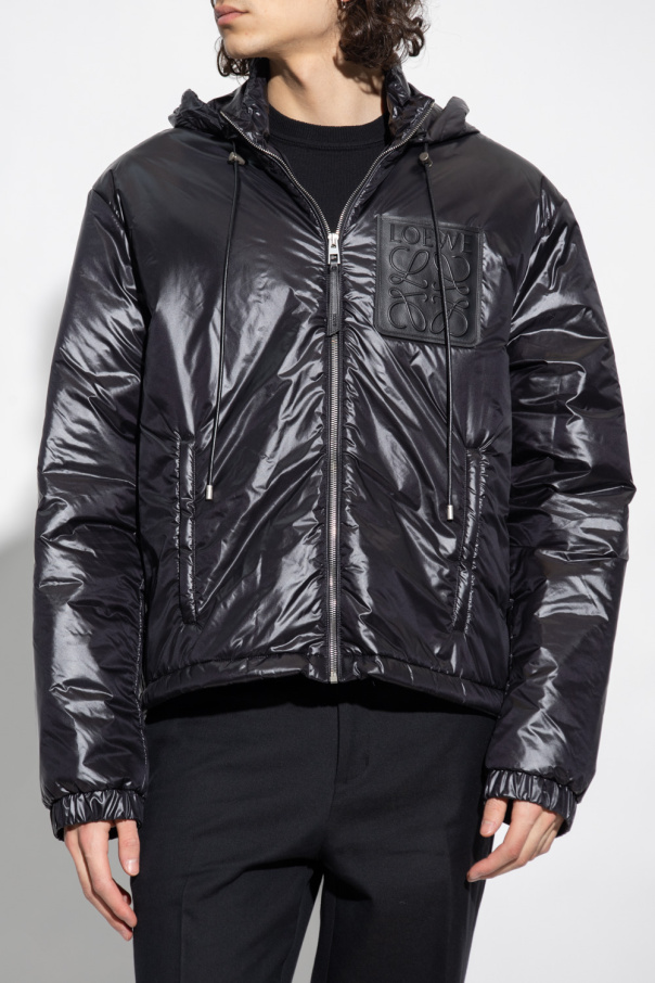 Black jacket from Loewe. Crafted from glossy material, this style fastens with a zipper and features a leather patch with a tactile logo, a drawcord-adjustable hood and hem, two front zip pockets and long sleeves with elasticated cuffs.