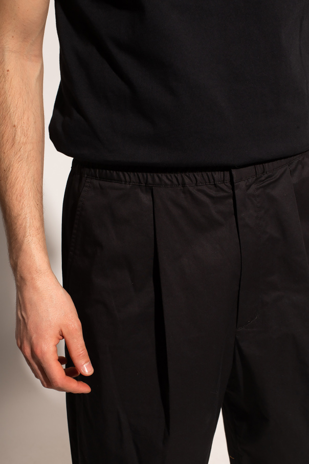 Black pleat-front trousers from Ambush. Made of cotton with gathers, this pair falls to tapered legs and features a zip fly with a button, two side seam pockets and two back button pockets.