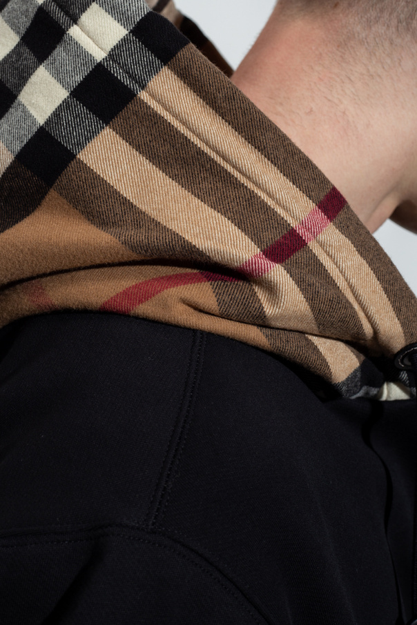 Black hoodie from Burberry. Made of cotton, this garment features a two-way zip, beige drawstring hood with the label’s signature check in black, white and red, two front pockets and ribbed trims at the hem and cuffs.