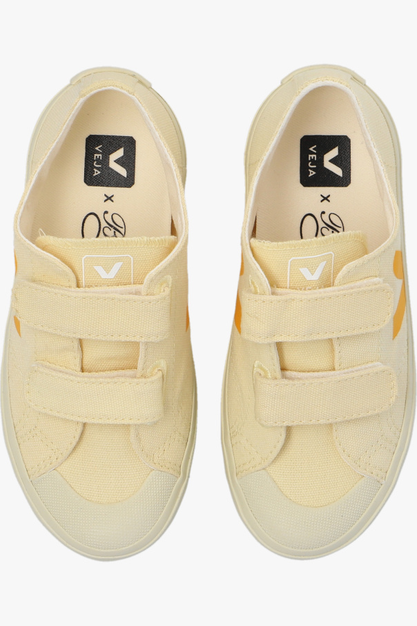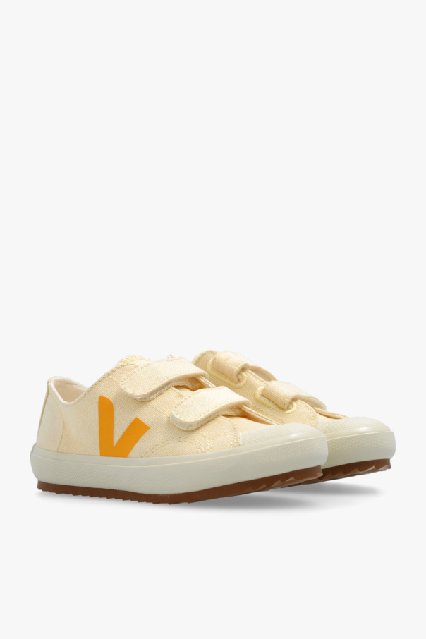 Cream ‘Small Ollie’ sneakers from Veja Kids. Crafted from organic cotton, this model sits on a brown sole made of Amazon rubber and showcases a water-based screen-print with the brand\'s logo in orange and velcro closures. The insole is made from sugar cane and organic cotton.