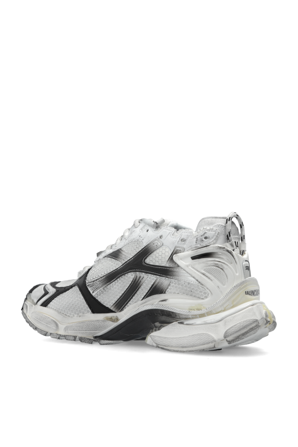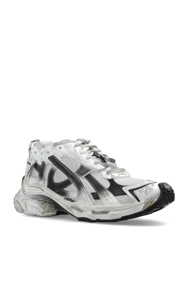 Discover the epitome of modern sophistication with the Runner sneakers by Balenciaga. These low-top sneakers boast a dynamic, contemporary design with distinctly defined structural elements, making them a statement piece in any wardrobe. The dominant white hue is elegantly contrasted by black and gray accents, with intricate black lines adorning the side panels to create a unique pattern. Crafted from premium textile materials with synthetic reinforcements, the Runner sneakers promise durability and comfort. The rubber sole, featuring a pronounced tread, ensures excellent grip, while the intricate stitching and additional reinforcements highlight the meticulous craftsmanship. Embellished with the iconic Balenciaga logo on the tongue and insole, these sneakers exude exclusivity. The number \"44\" on the front sole signifies the shoe size, adding a personalized touch. Complemented by a comfortable inner lining and secure lacing system, these sneakers provide an impeccable fit. Why Choose This Product? Striking, modern design with distinctive structural elements. Premium textile upper with synthetic reinforcements for enhanced durability. Iconic Balenciaga branding for a touch of exclusivity. Comfortable inner lining and secure lacing system for optimal fit. Durable rubber sole with excellent grip.