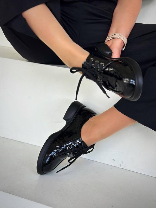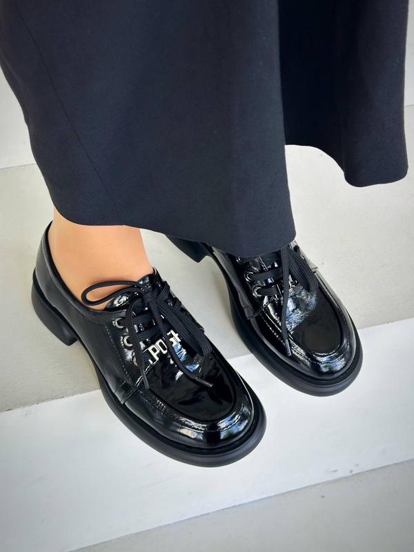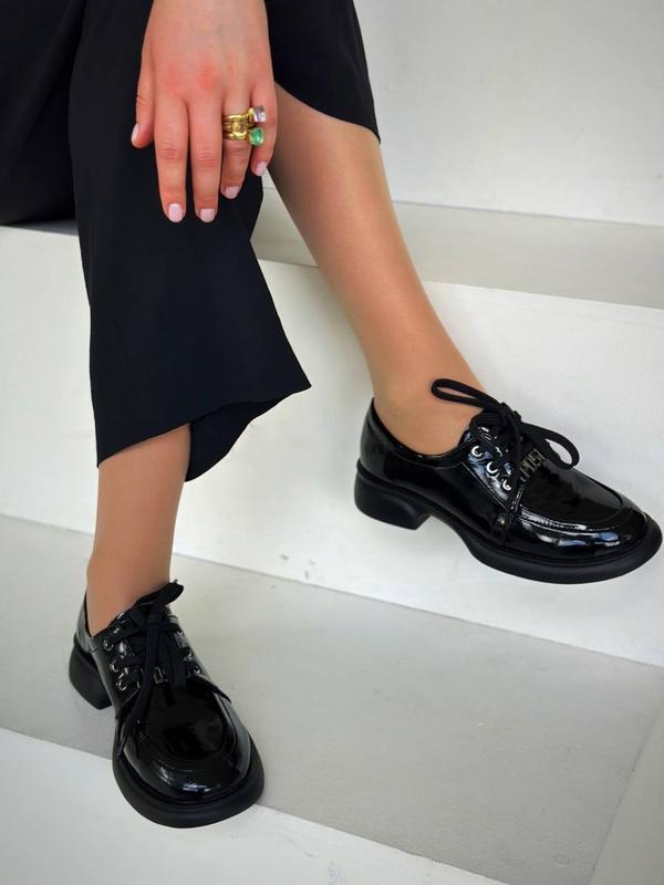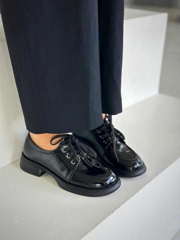 Зроблено в Україні?:Виробництво ,Матеріал:Лакована шкіра ,Висота каблука:Низький ,Тип підбору:Квадратний ,Сезон:Осінь , Весна , Демісезон ,Принт:Без принту ,Тип:Броги ,Стиль:Повсякденний ,Тип підошви:Каблук ,Форма носка:Круглий ,Опис