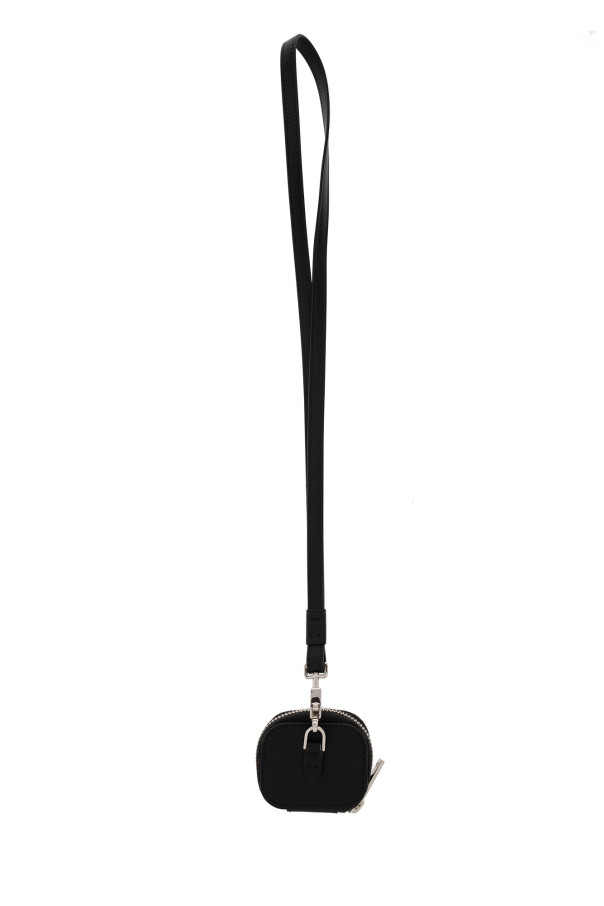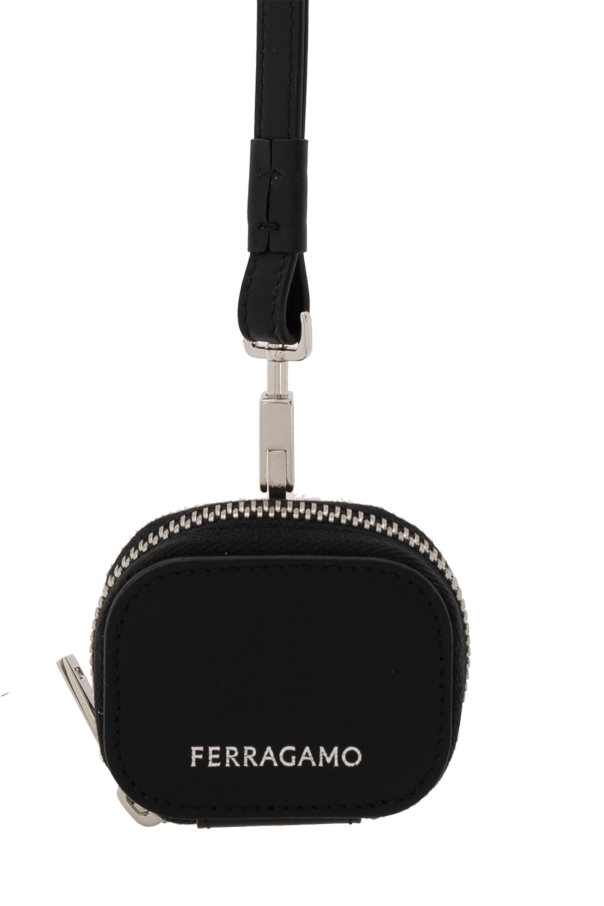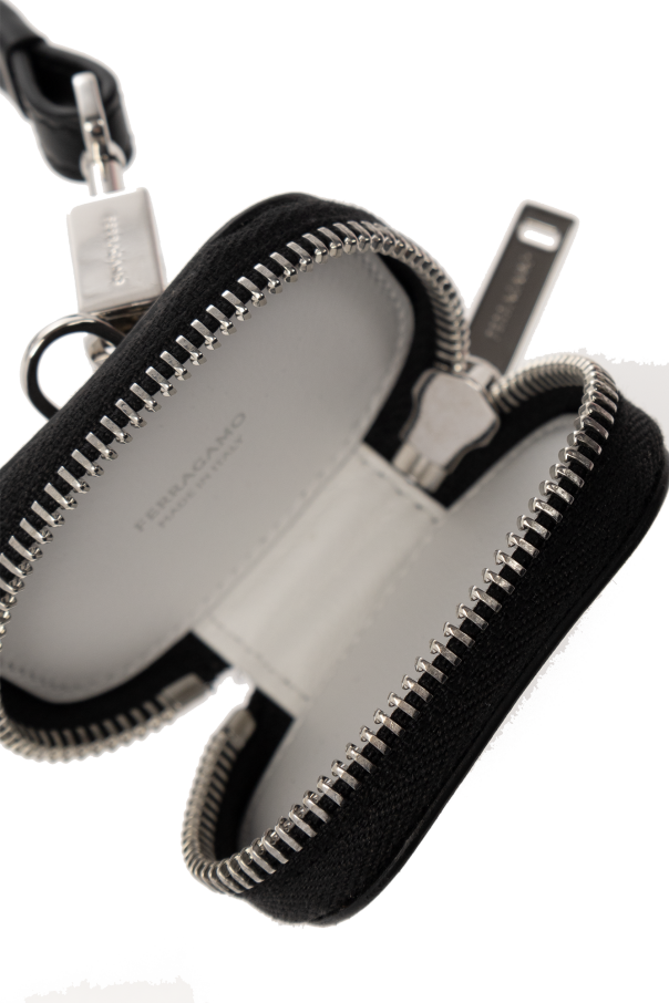 Black AirPods case from FERRAGAMO. Made of calf leather, this item fastens with a zip and showcases a printed silver-tone logo on the front. It is complete with a detachable strap and silver-tone metal hardware.