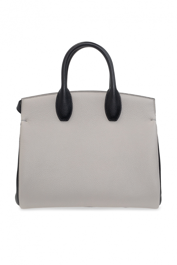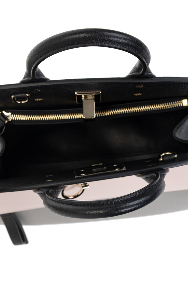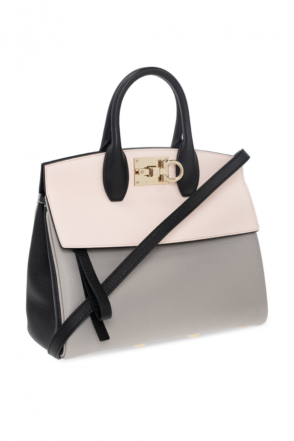 Black, grey and light pink ‘Studio Bag Small’ shoulder bag from Salvatore Ferragamo. Made of calf leather, this design secures with a decorative fastener and features a zipped pocket on the front, two half-round handles, a detachable and adjustable shoulder strap, gold-tone metal hardware and one internal compartment with three slip pockets and a removable zipped pouch.
