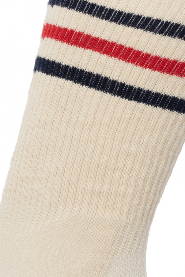 Cream socks from Gucci. Produced from a cotton blend, this pair comes enriched with a red, embroidered logo pattern and stripes in navy and red.