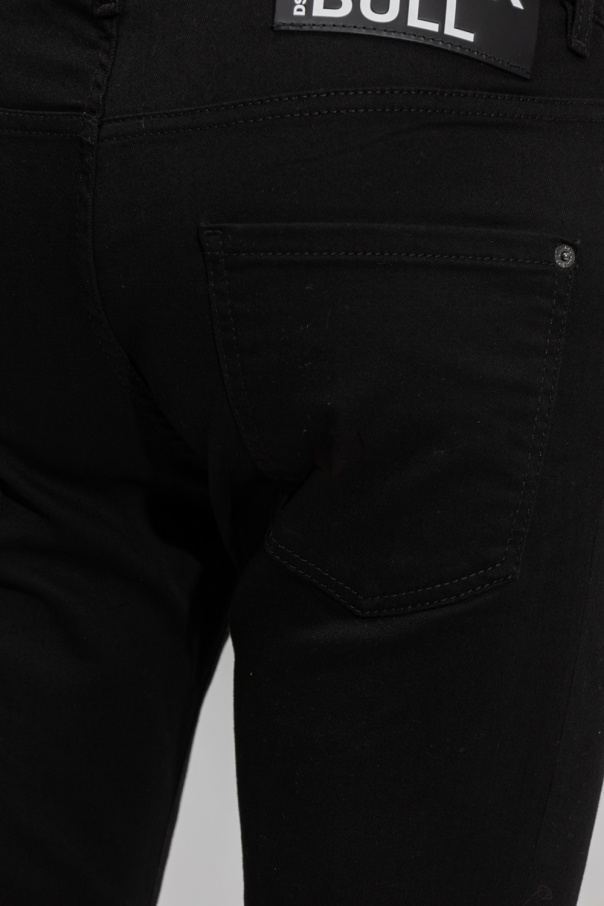 Black ‘Skater’ slim-fit jeans from Dsquared2. Falling with tapered legs, this pair features button fastenings, classic five pockets, distressed details and logo patches on the front and back.