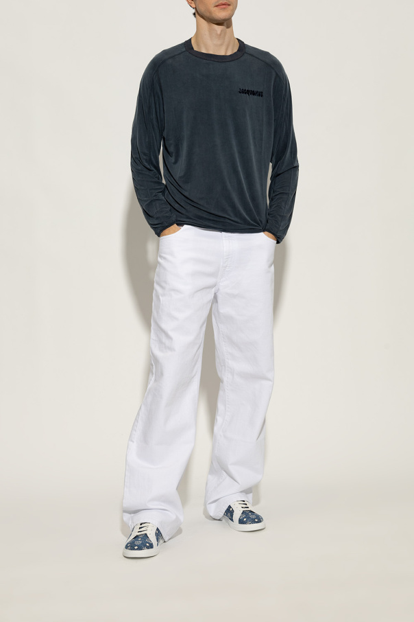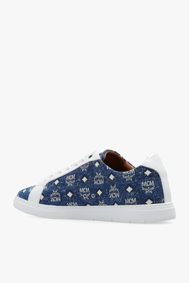 Blue and white ‘Terrain Lo’ sneakers from MCM. Made of denim enriched by a jacquard monogram pattern and leather trimming, this lace-up pair features a silver-tone metal logo detail on the tongue and white rubber sole.