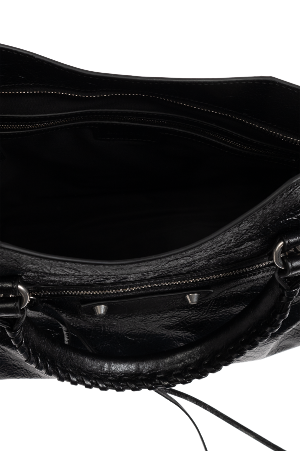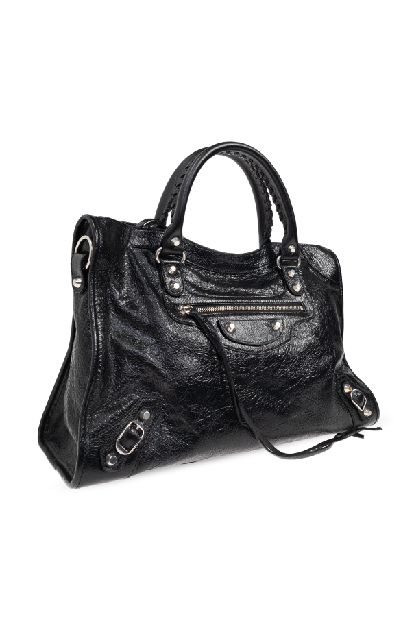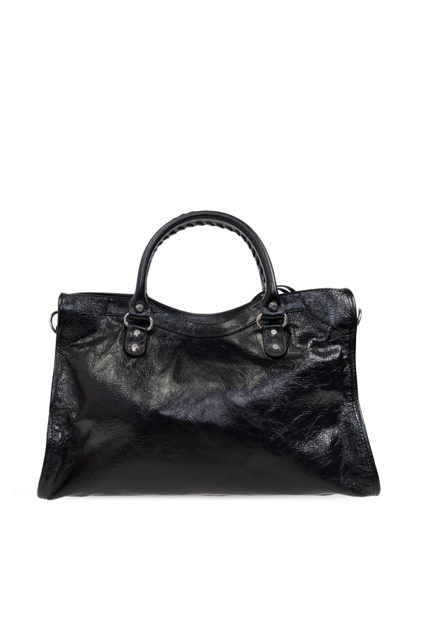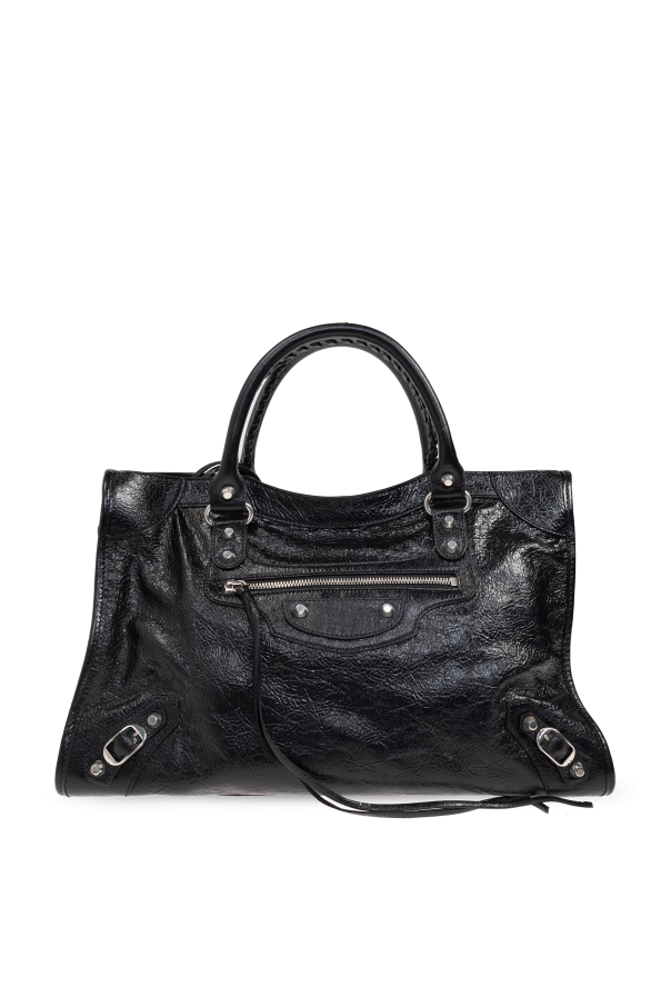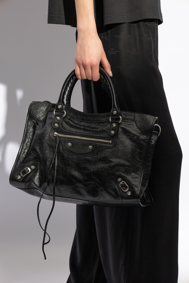 Introducing the Le City Medium handbag, an epitome of sophistication and timeless elegance, crafted by the renowned fashion house Balenciaga. This exquisite piece is meticulously fashioned from luxurious black leather with a subtle sheen, exuding an aura of opulence. Its classic rectangular silhouette with gently rounded edges is artfully designed for both style and functionality. The bag features dual handles for handheld elegance, complemented by chic metallic accents, such as studs and zippers, lending a contemporary flair. A front zippered pocket ensures accessibility and convenience. The spacious interior, showcasing a main compartment and an additional zippered pocket, underscores its practicality, making it an ideal companion for the modern connoisseur. Additionally, the detachable shoulder strap offers versatile carrying options, adapting seamlessly to any occasion. Why Choose This Product? Crafted from premium black leather with a luxurious finish. Designed by the illustrious Balenciaga, a name synonymous with haute couture. Features practical interior space with a secure zippered pocket. Includes a detachable shoulder strap for versatile styling. Embodies the perfect blend of elegance and functionality.