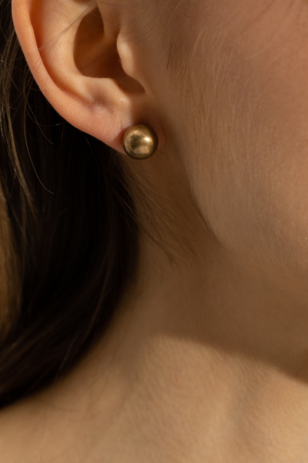 Asymmetrical earrings in antiqued gold-tone from Dries Van Noten. Fastened with push back closures. One earring is long and showcases a blue glass orb.