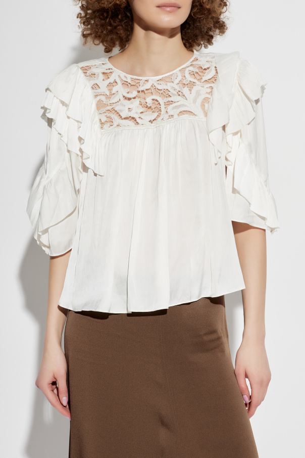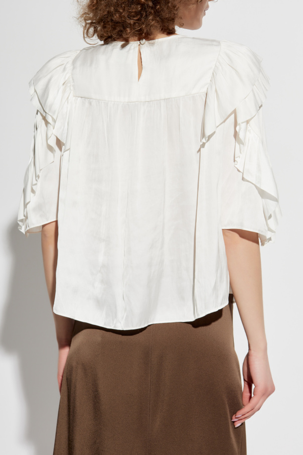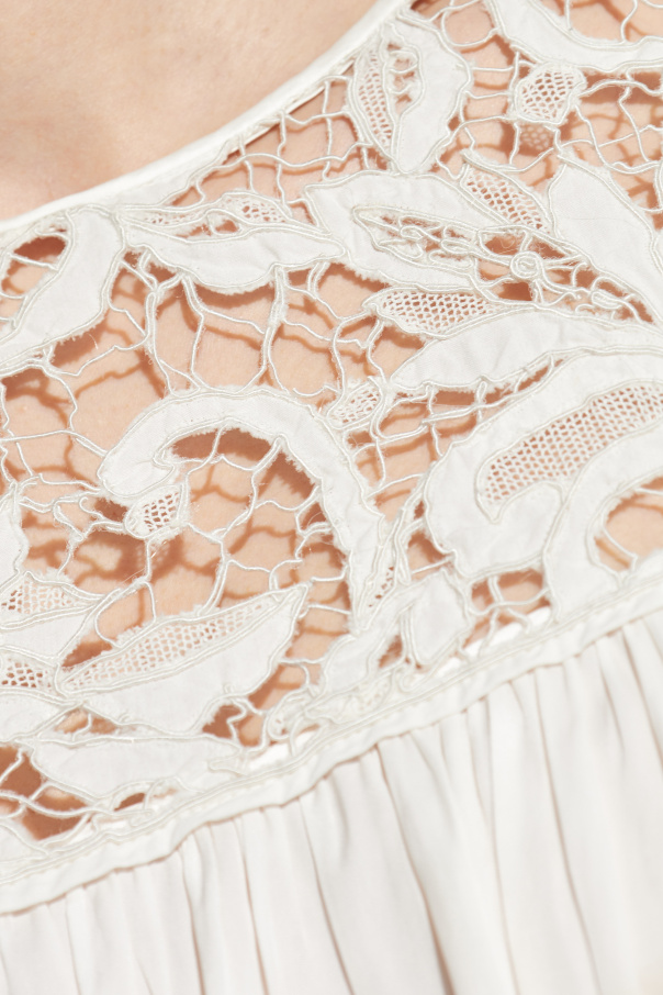 Introducing the Top \"Syrane\", a sublime creation from the esteemed designer Isabel Marant, whose genius has revolutionized the fashion world. This exquisite top, in a delicate cream hue, is crafted from a lightweight polyester fabric, offering an ethereal drape and unparalleled comfort. The loose silhouette is accentuated by a meticulously crafted lace insert at the neckline, bestowing a touch of elegance and sophistication. The sleeves, adorned with triple-layered flounces, imbue the garment with a romantic allure, while the back closure with a single button completes this masterpiece with subtlety. Paired effortlessly with a long, brown skirt, the Top \"Syrane\" exudes an air of elegance, embodying the timeless sporty sophistication that defines Marant\'s collections. Why Choose This Product? Designed by renowned fashion visionary Isabel Marant. Elegant cream color with intricate lace detailing. Lightweight and comfortable polyester fabric. Romantic triple-layered flounce sleeves. Effortless elegance for any occasion.