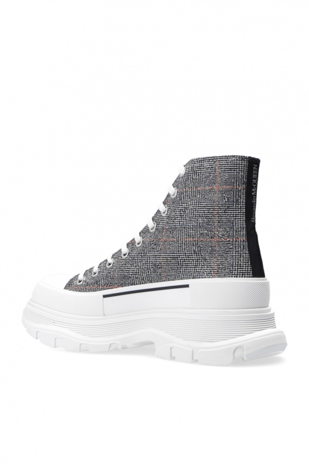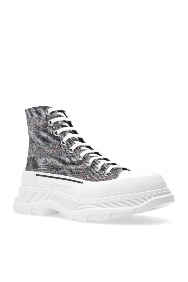 Grey sneakers from Alexander McQueen. Set on a white rubber sole, this lace-up design features a check pattern and an embossed logo in white.