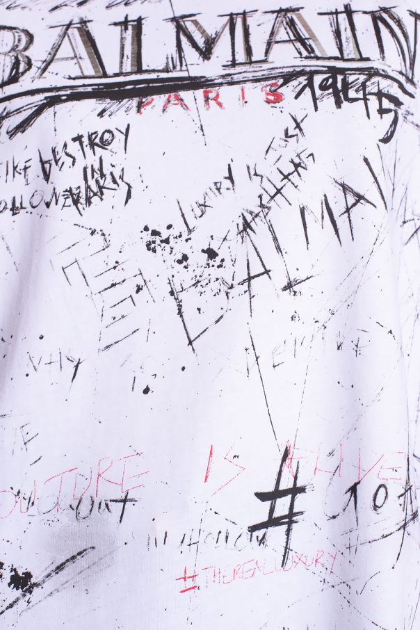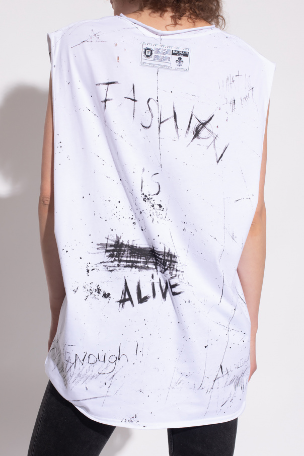 White, loose-fitting, sleeveless T-shirt from Balmain. Made of cotton, this garment features a faded effect, paint splatter, black and silver-tone logo print, logo patch at the back and ribbed crew neck.