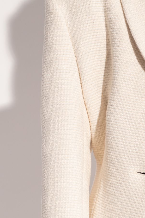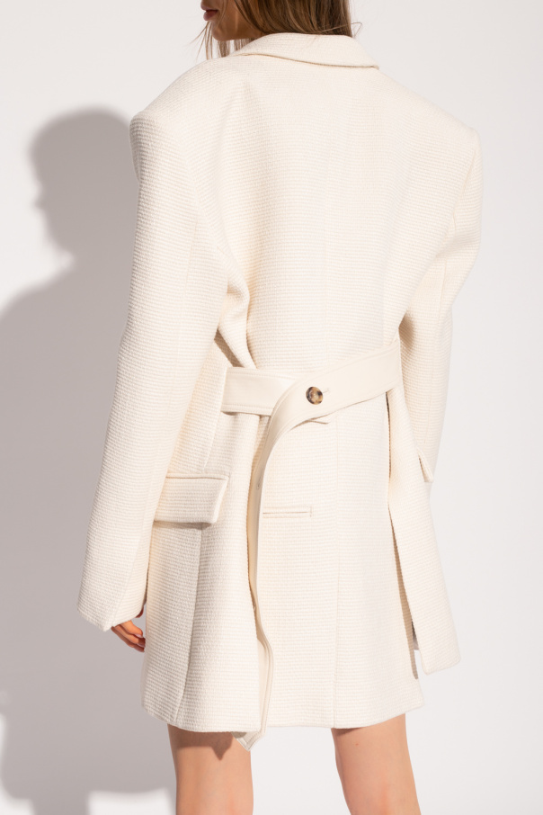Cream ‘Pireus’ coat from The Mannei. Crafted from a cotton and linen blend with a touch of metallic thread, this style features a cropped silhouette, button fastenings, peak lapels, three slip pockets side splits, long sleeves with vents and an adjustable leather belt accompanied by a distinctive pocket at the back.