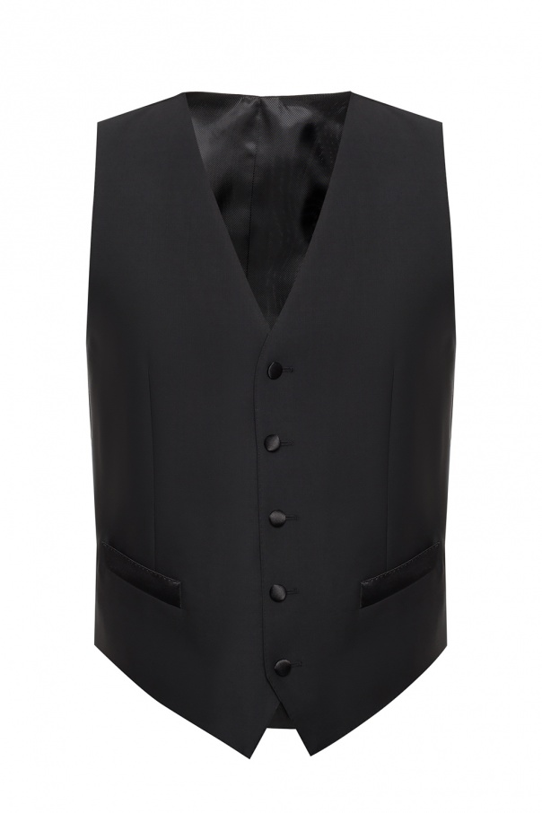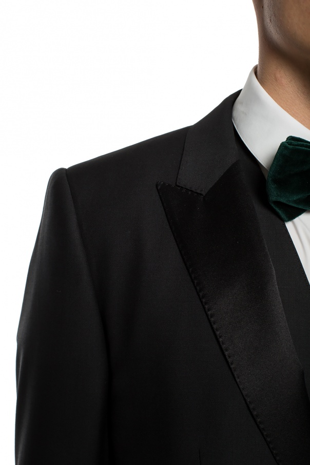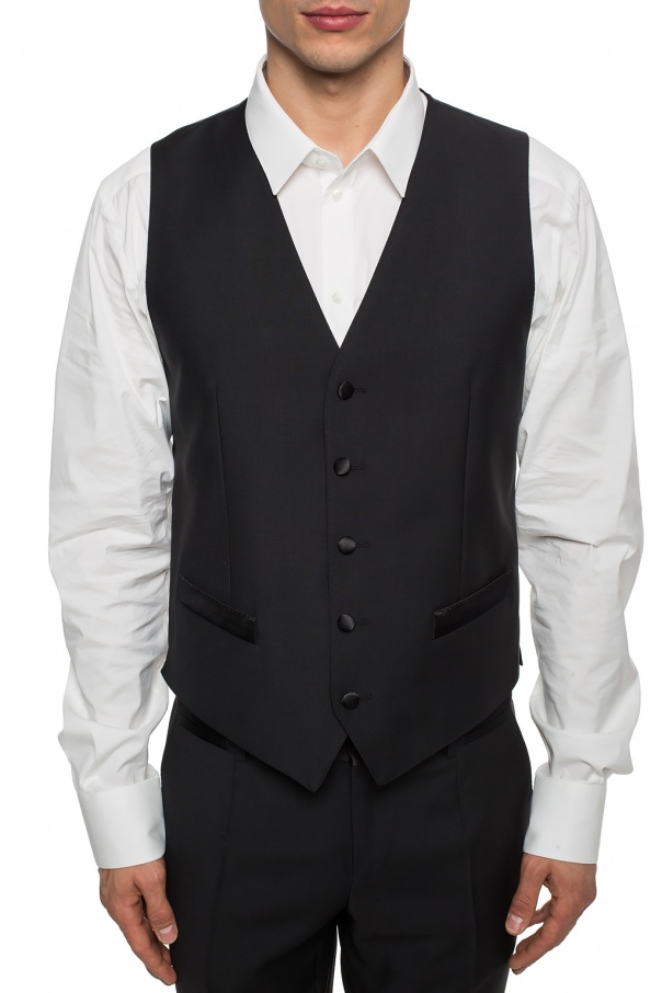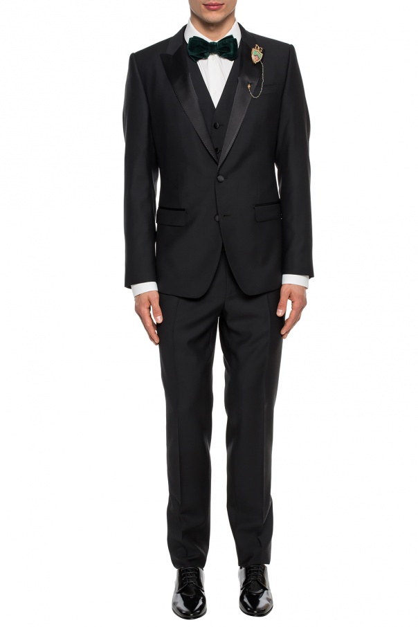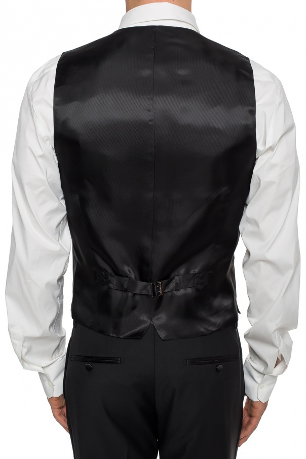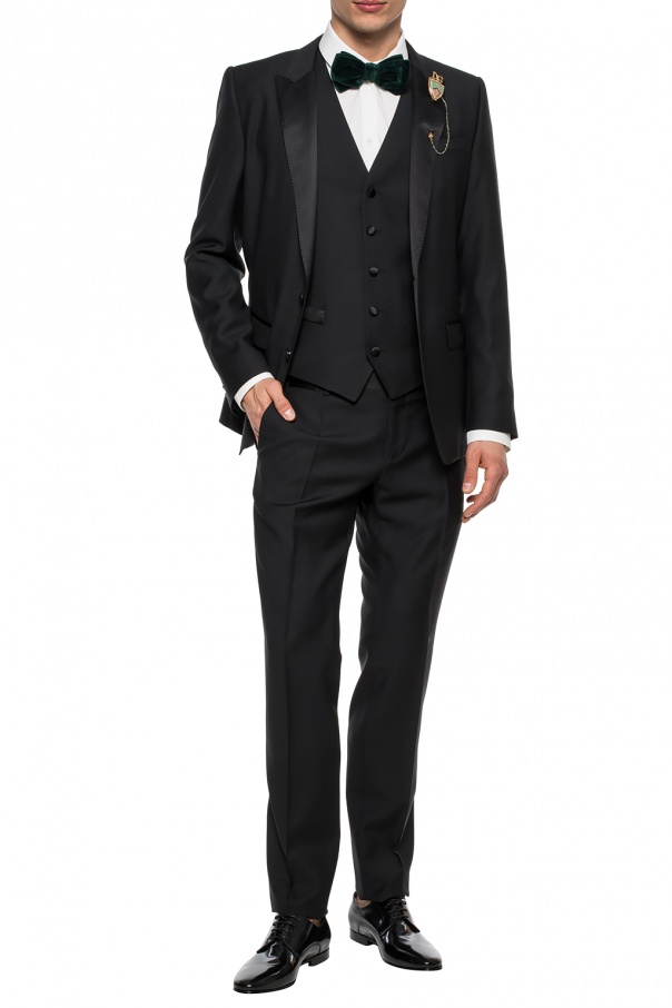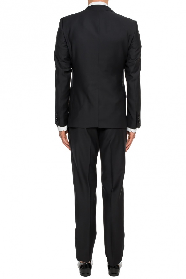 Black, three piece suit from Dolce & Gabbana. Blazer with peak lapels made of wool and silk blend. Fastened with a button. It features 2 flap pockets and 1 slip pocket on the front as well as single split vent on the back. Vest fastened with buttons. It features 2 slip pockets on the front and a belt on the back. Pleat-front trousers fastened with a zip and a button. They feature slip 2 pockets on the front and 2 pockets fastned with buttons on the back. Tapered legs