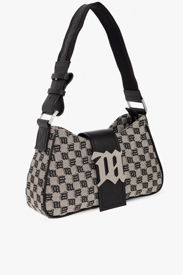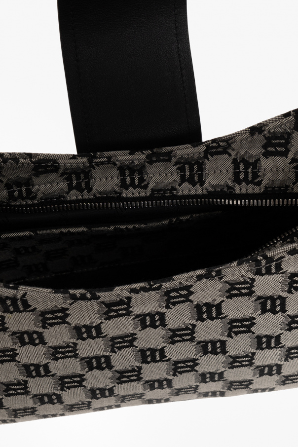 Beige and black ‘Monogram Medium’ shoulder bag from MISBHV. Crafted from waterproof jacquard monogram pattern, this design features a magnetic snap with a monogram and zip, adjustable shoulder strap, silver-tone metal hardware and one internal compartment with pocket with a magnetic snap.