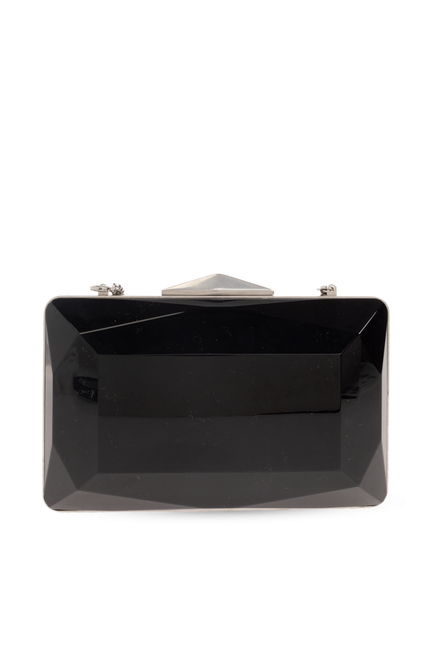 White and black ‘Diamond Box’ clutch from Jimmy Choo. Made of satin, this design features a diamond-shaped snap closure with an engraved logo, detachable shoulder chain, one internal compartment and silver-tone metal hardware.