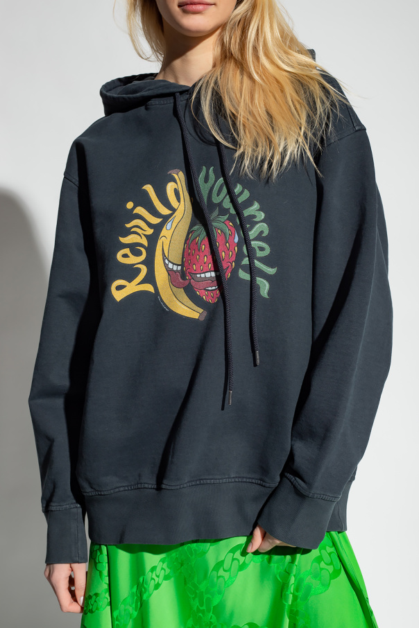 Black sweatshirt with a drawstring hood from Stella McCartney. Crafted from sustainable cotton with a washed effect, this style features a relaxed fit, a colourful fruits print on the front and elasticized trims on the bottom hem and cuffs.