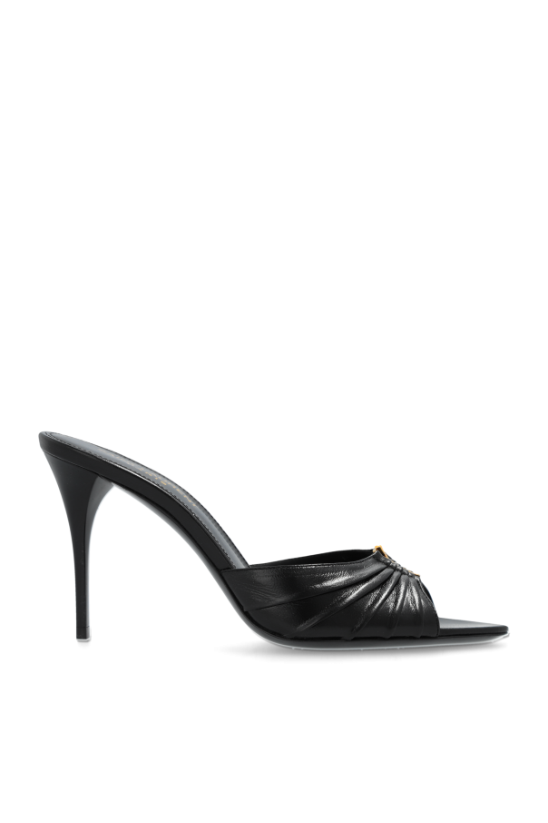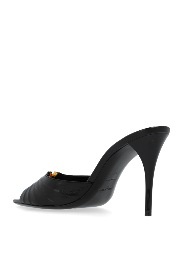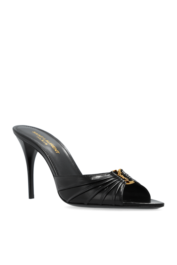 Presenting the epitome of sophistication, the Babylone Heeled Mules by the renowned designer Saint Laurent. These exquisite black mules are a testament to the brand\'s commitment to luxury and craftsmanship. The mules feature a sleek, high stiletto heel, elegantly accentuating the feminine silhouette. The open-toe design adds a touch of lightness, allowing for an exquisite display of the feet. The front of the mule boasts a delicately ruched texture, imparting a rich, textural appearance. At the heart of the design lies the iconic gold YSL logo, exuding prestige and underscoring the product\'s luxurious nature. Crafted from the finest black leather, both the exterior and interior of the mules ensure durability and unparalleled comfort. The insole is adorned with the golden inscription \"SAINT LAURENT PARIS,\" certifying the authenticity and exclusivity of the product. The timeless black hue of the Babylone mules renders them a versatile addition to any wardrobe, effortlessly complementing various outfits. Styled with an elegant leather skirt and jacket, they exemplify versatility, making them perfect for evening outings or formal occasions. Why Choose This Product? Elegant design with a high stiletto heel Luxurious ruched texture with iconic YSL logo Crafted from premium black leather for durability and comfort Authentic \"SAINT LAURENT PARIS\" gold inscription Versatile black color suitable for various styles
