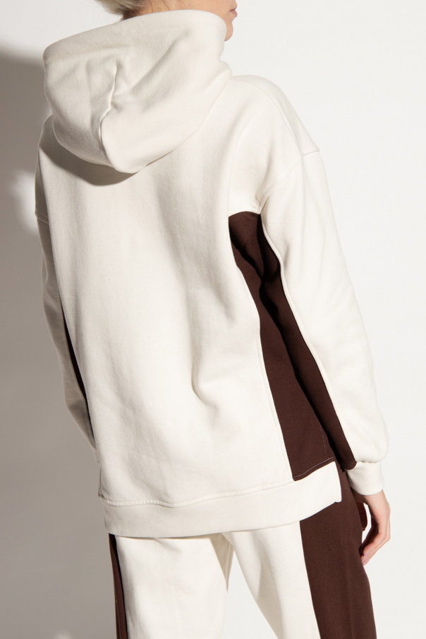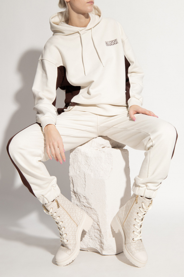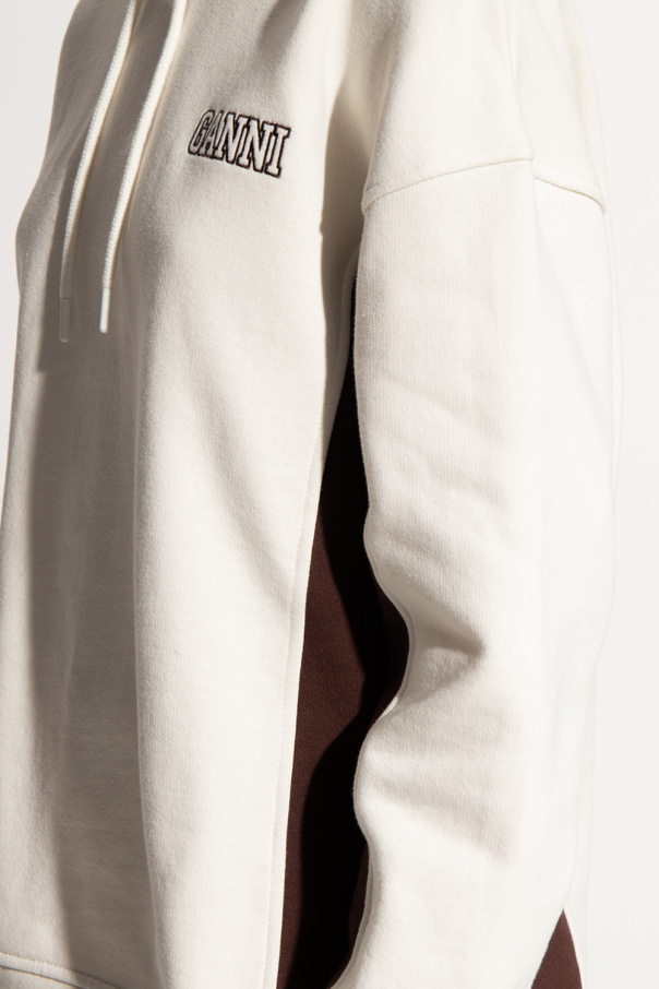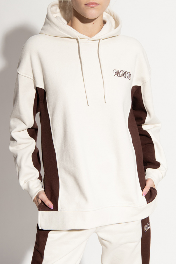 Cream and brown hoodie from Ganni. This garment is complete with a drawstring hood, brown logo embroidery, side vents and ribbed cuffs. Made of organic, recycled cotton with the international Global Organic Textile Standard (GOTS) certificate and recycled fabric with the Global Recycled Standard (GRS) certificate.