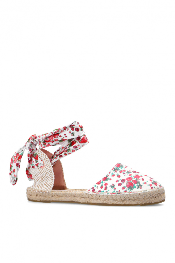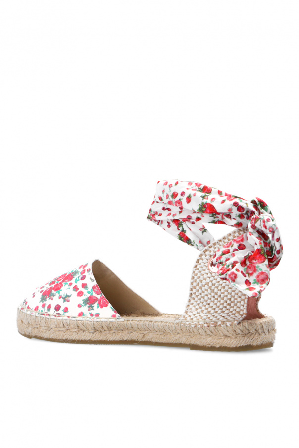 Cream and beige sandals from Manebi x LoveShackFancy, the ‘LoveShackFancy Loves Manebí’ collection. Crafted from suede, this model showcases a floral pattern, an open heel and a self-tie fastening at the ankle. The sole was made of natural jute trimmed with a thin layer of grey caoutchouc.