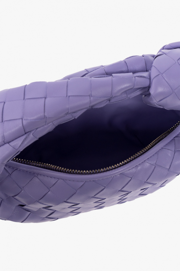 Purple ‘Jodie Mini’ hobo handbag from Bottega Veneta. Crafted from lamb leather accentuated with the brand\'s signature Intrecciato weave, this design features a zip fastening, a half-round handle with a distinctive knot, silver-tone metal hardware and one internal compartment.