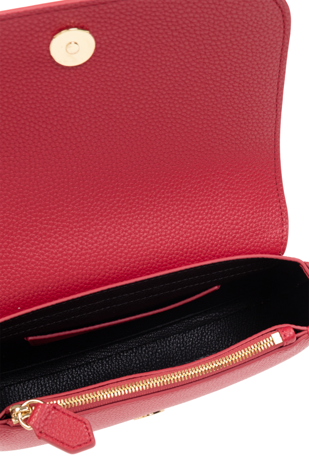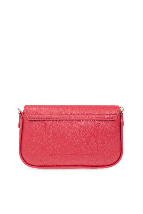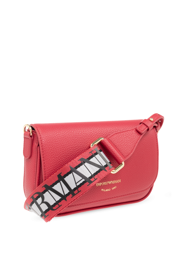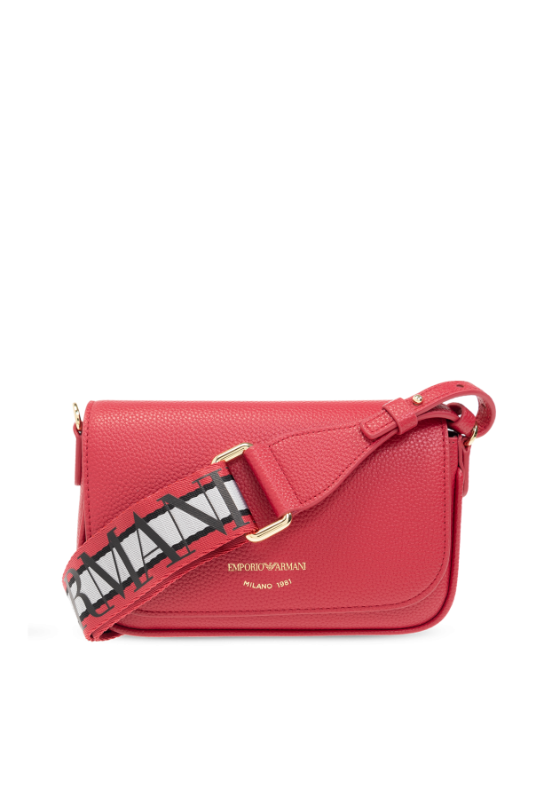 Red shoulder bag from Emporio Armani. Made of a faux leather, this model features a magnetic snap, silver-tone logo print on the front, detachable and adjustable strap in red, black and grey with printed black logo, black lining, one internal compartment with one zip pocket and one card slot.