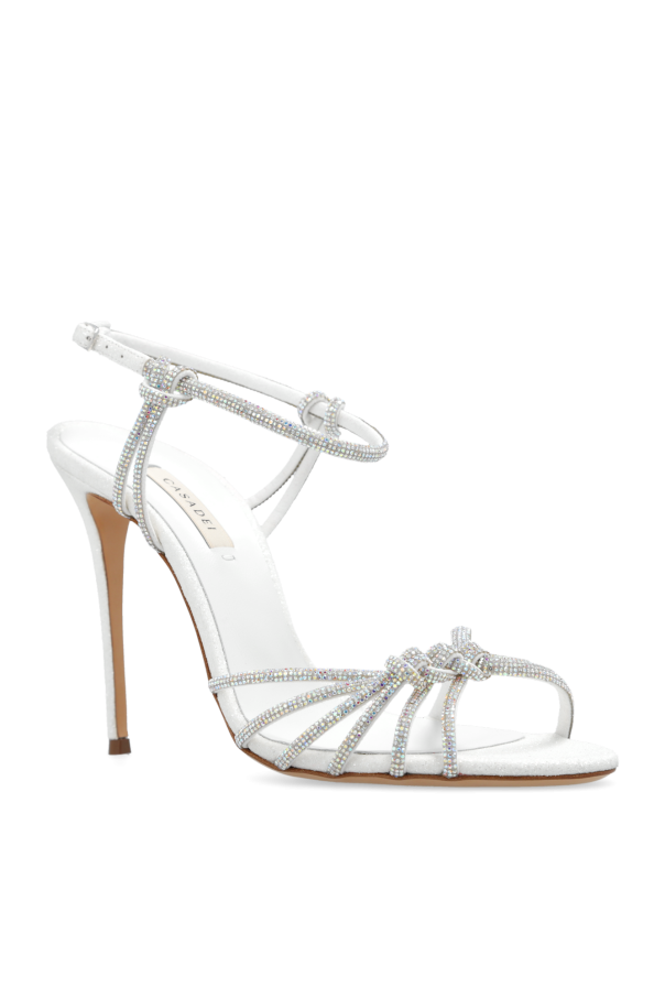 White ‘C+C’ heeled sandals from Casadei. Crafted from fabric with a glitter finish, this design features an adjustable buckled ankle strap, woven details, crystals, an almond toe and a beige leather sole.
