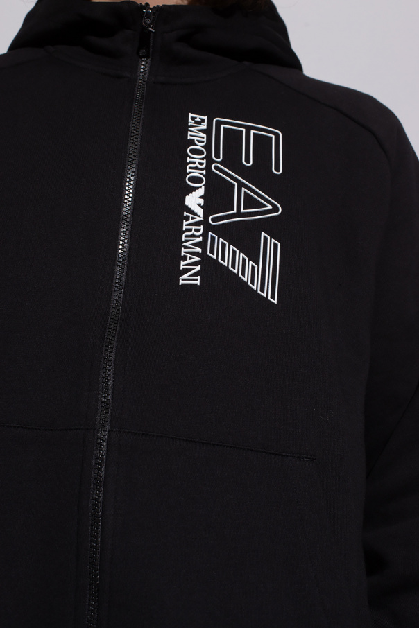 Black hoodie and sweatpants from EA7 Emporio Armani. Made of cotton, this set is decorated with a raised logo in white. The hoodie has a zip fastening, two slip pockets and ribbed trims at the hem and cuffs. The sweatpants with an elastic waistband with drawstrings, two slip pockets and ribbed cuffs.