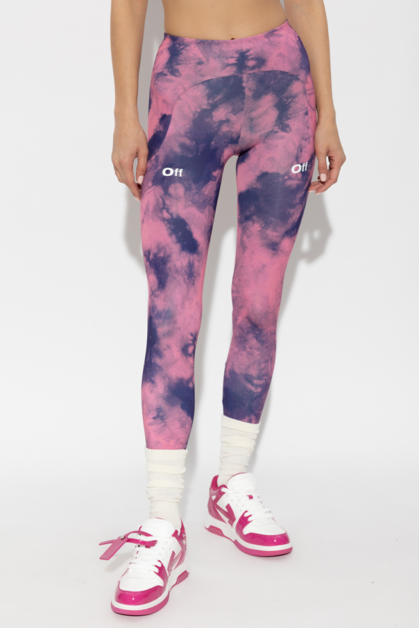 Pink and navy blue training leggings from Off-White, the ‘Active’ line. Embellished with a tie-dye motif, this style features an elasticated waistband, a high-rise waist and a printed white logo on the front.