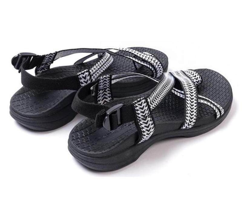 Эти сандалии с верхом из мягкого текстиля и перекрещивающимися ремешками обеспечивают удобную посадку и поддержку при каждом шаге. Эта пара с однотонным рисунком в виде стрелок для игривого прикосновения имеет плоскую резиновую подошву с формованной стелькой для оптимального комфорта. Пара фиксируется регулируемой застежкой на щиколотке для индивидуальной подгонки.