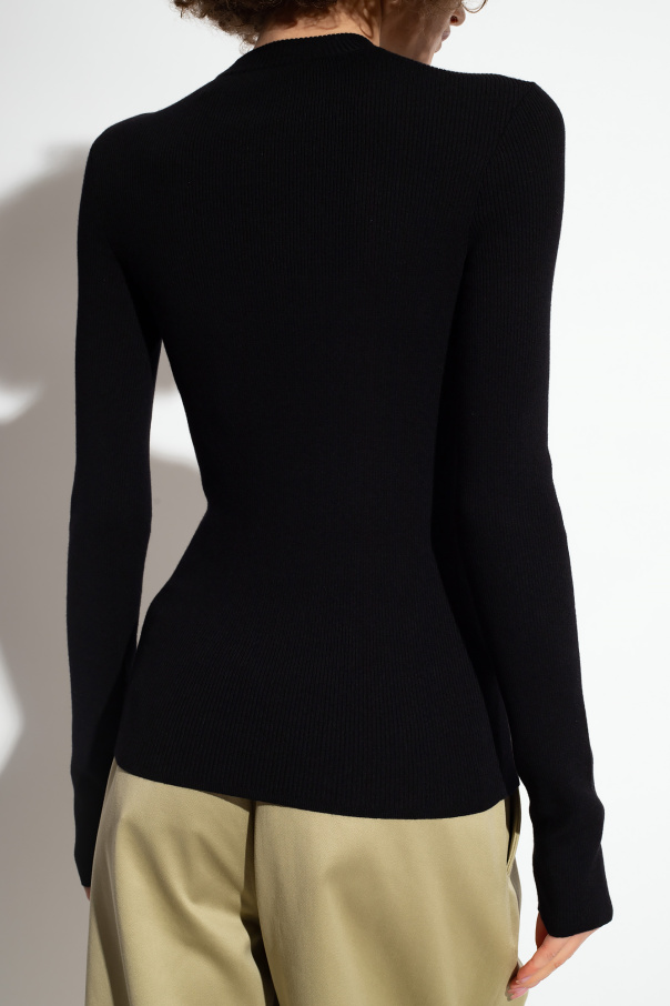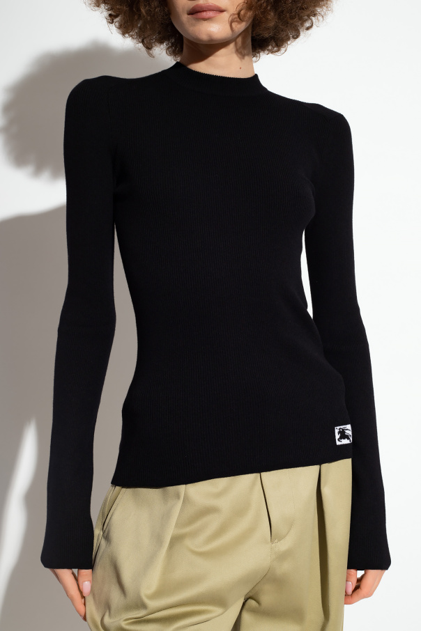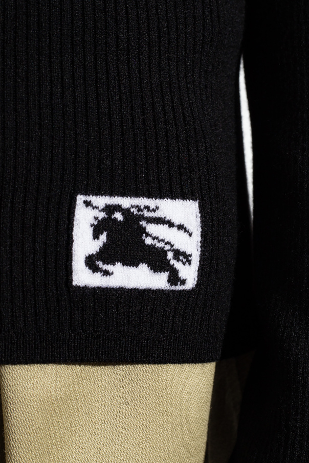 Black crewneck sweater from Burberry. Made from wool, this style showcases an embroidered black and white logo on the front, long sleeves and ribbing on the collar, bottom hem and cuffs.