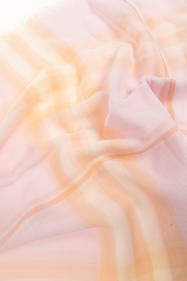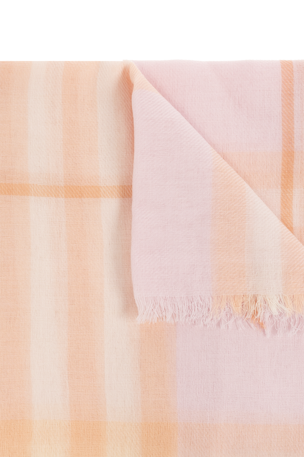 Light pink scarf from Burberry. Made from wool, this item showcases a colourful pattern with a signature check motif and frayed ends.