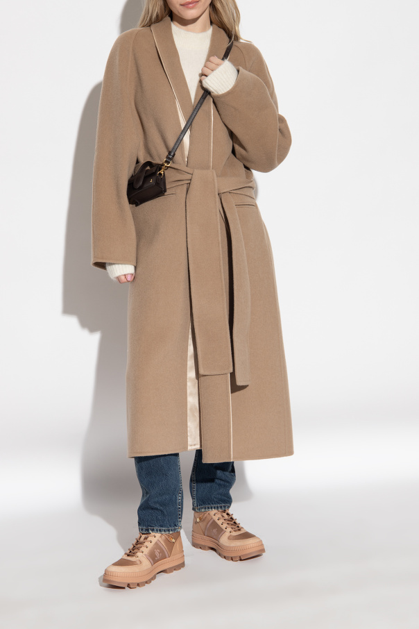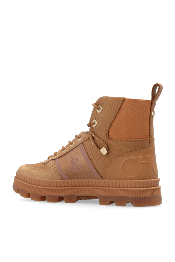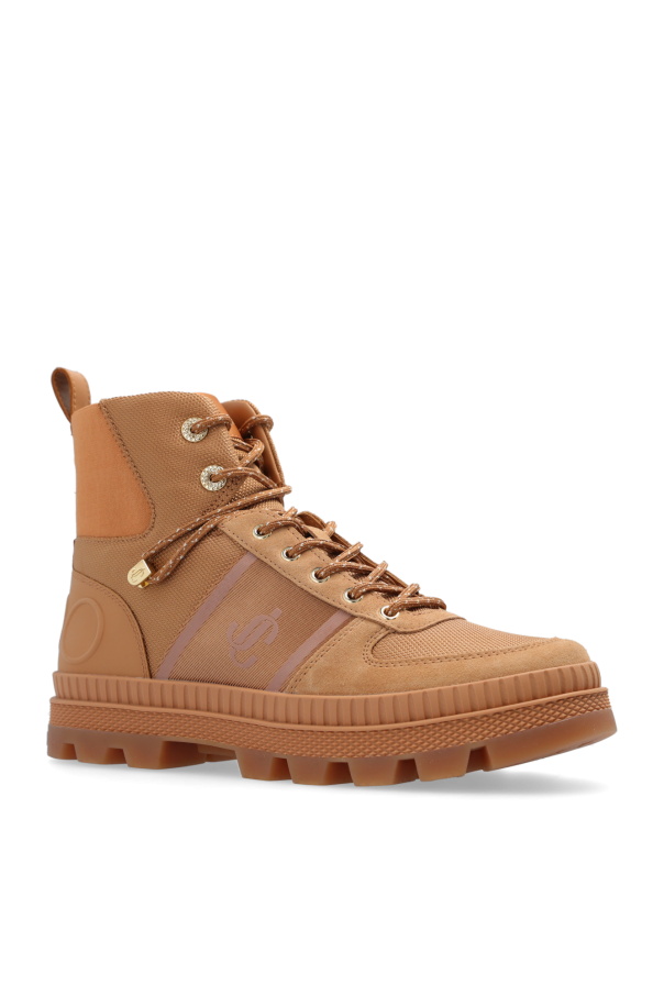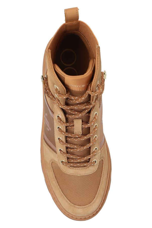 Light brown ‘Normandy’ high-top sneakers from Jimmy Choo. Crafted from leather and fabric, this lace-up model sits on a light brown rubber sole and showcases the brand\'s logo.