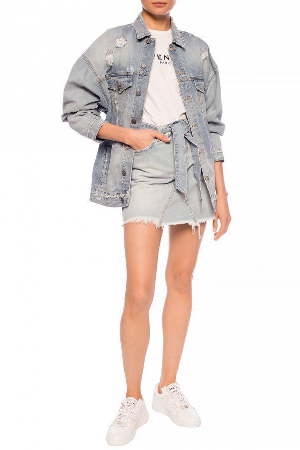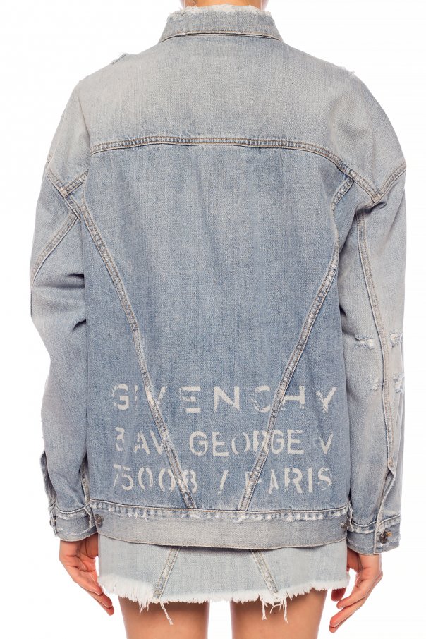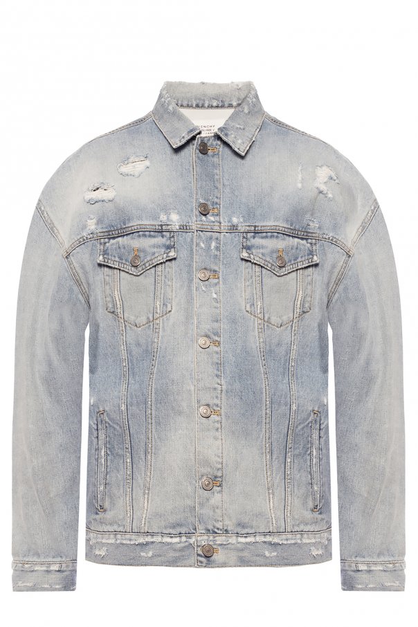 Light blue stonewashed denim jacket from Givenchy. Fastened via buttons. Embellished with printed logo. Features long sleeves, raw hems and 2 slip pockets and 2 button-fastened flap pockets on the front.