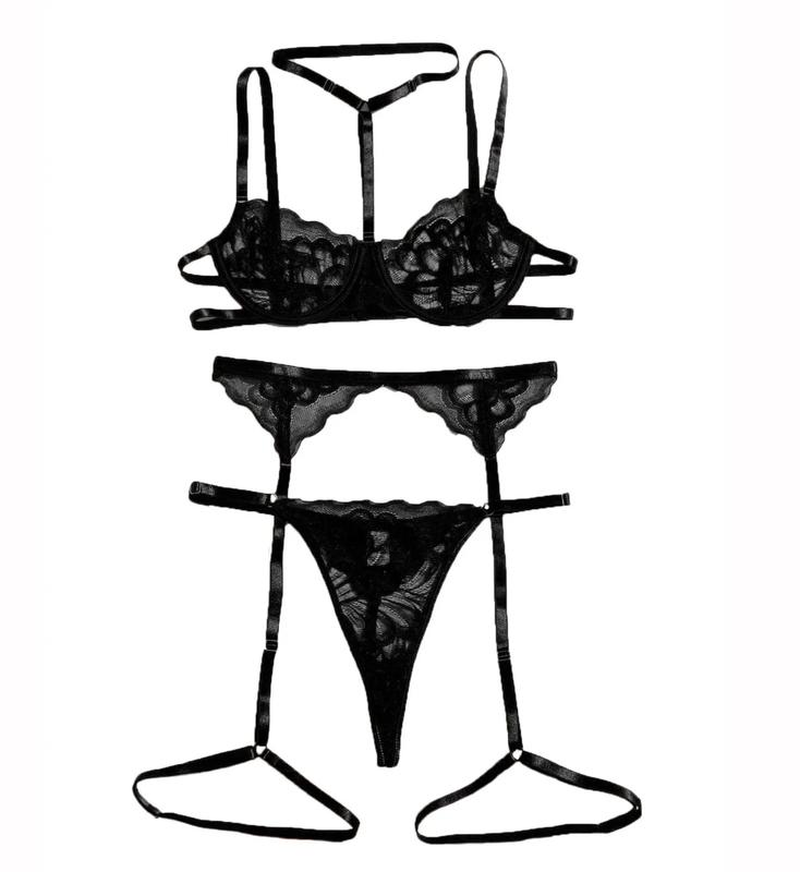 Комплектация: трусики с регулировкой, лиф с косточками и чокером, пояс с гартерами.Размерная сетка: