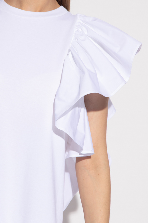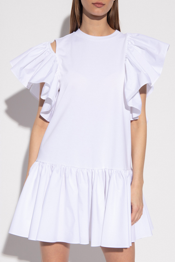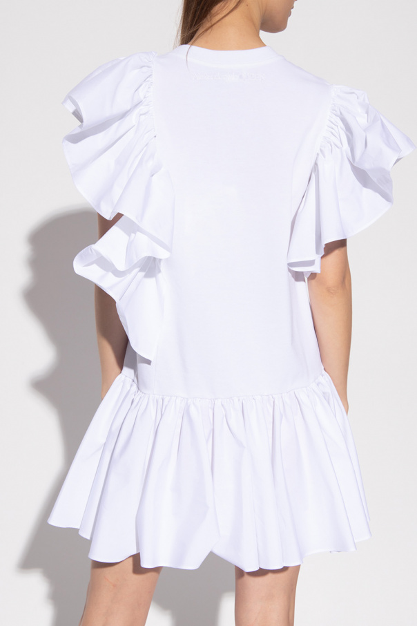 White dress from Alexander McQueen. Made of cotton, this garment features a logo embroidery at the back, round neck and decorative sleeves with cut-outs and ruffle trims.