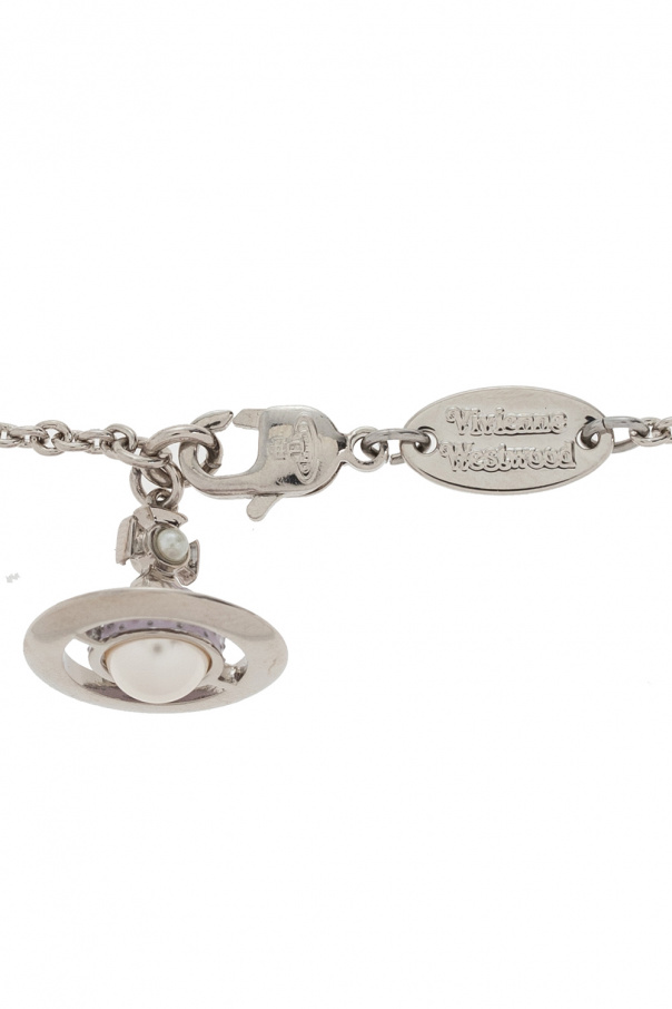 Silver-tone and light purple ‘Simonetta’ bracelet from Vivienne Westwood. Made of brass, this item secures with a stud fastener and features a pendant with a logo, light purple enamel finish and a faux pearl.