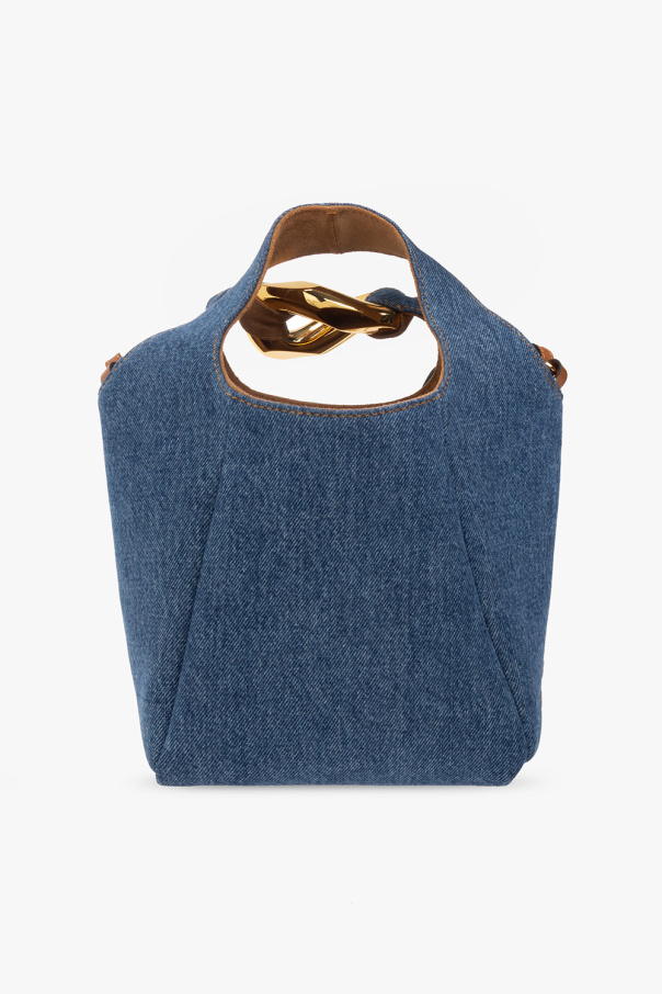 Reversible, blue and brown ‘Chain Link Pochette’ shoulder bag from J.W. Anderson. Made of denim and suede, this model features a logo-embossed patch, woven handle with a chain link detail, detachable and adjustable shoulder strap, one internal compartment and gold-tone metal hardware.