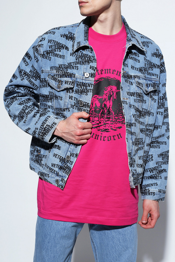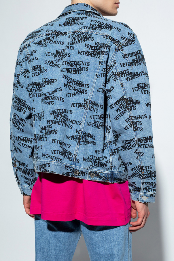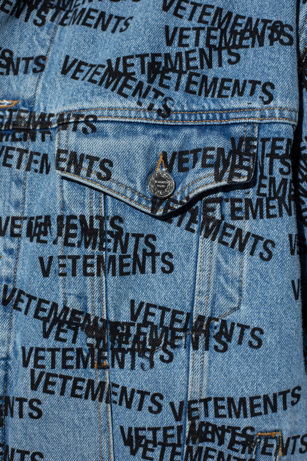 Light blue denim jacket from VETEMENTS. Fastened with buttons, this garment features a black logo print, two slip pockets, two buttoned flap pockets and button cuffs.