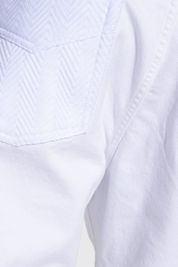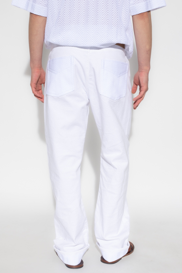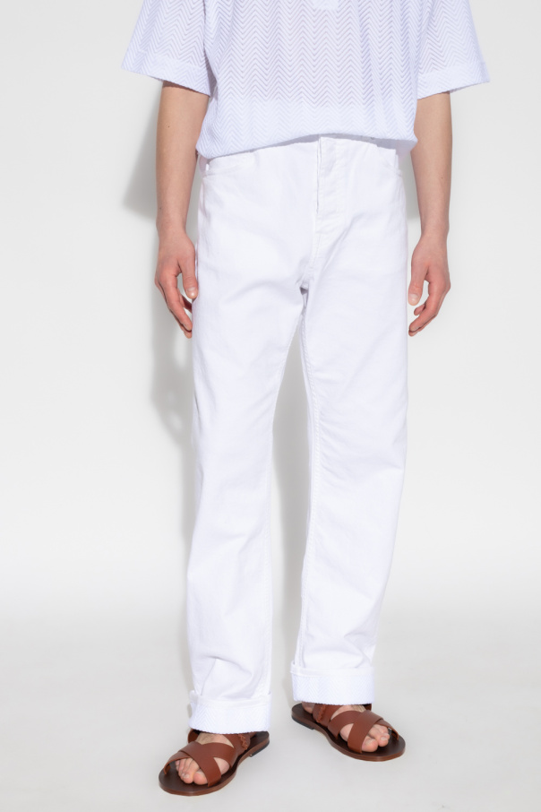 White jeans from Missoni. Embellished with inserts including the brand\'s signature zigzag motif, this pair falls with straight legs and features a zip fly with a button, classic five pockets, turned-up cuffs and a brown logo patch at the back.