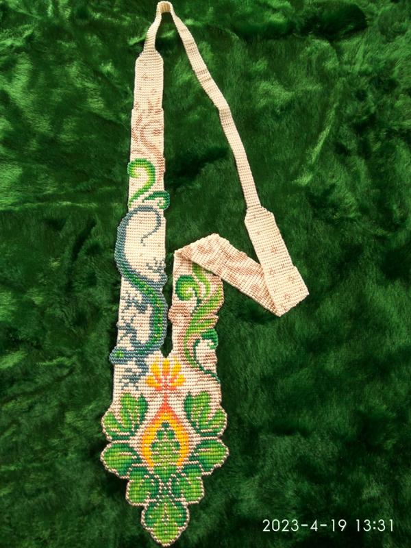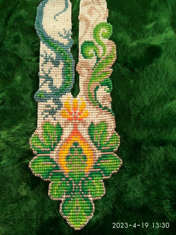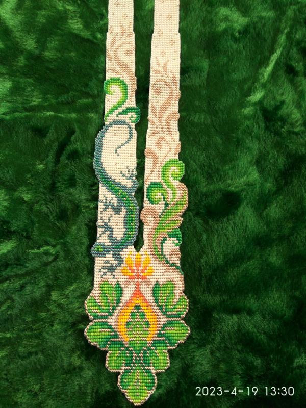 Гердан с дошивом в виде бутона зеленого цветка и ящерицой - элегантное украшение на каждый день.Гердан выполнен из чешского бисера на капроновой нитке.