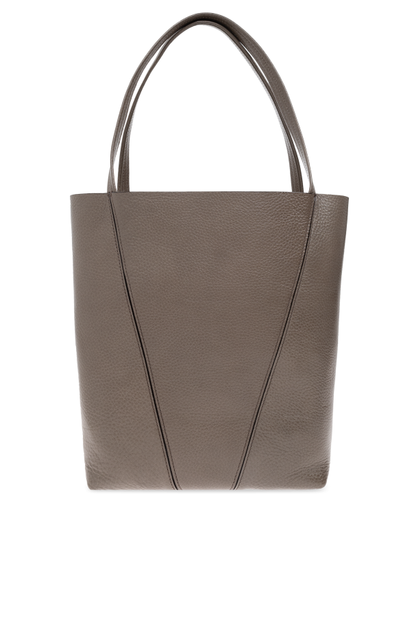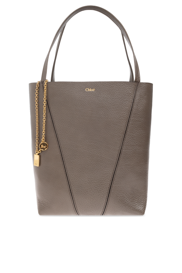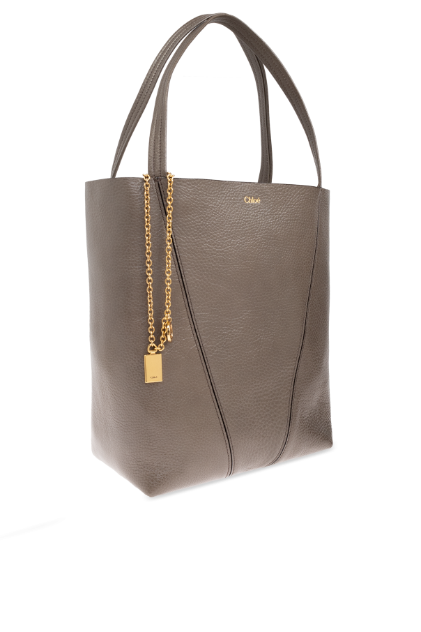 Introducing the Spin Medium Shopper Bag by Chloé, a paragon of elegance and functionality. This rectangular masterpiece, crafted from supple leather, exudes a refined sophistication in its warm brown hue. The bag is adorned with a golden chain, featuring an ornate medallion and a chic charm inscribed with \"Chloé\". A subtle gold logo graces the front, enhancing its classic allure. Designed for practicality, the bag boasts long handles for comfortable shoulder wear, while its spacious interior offers ample room for daily essentials. The khaki lining adds a touch of contrast, ensuring both style and utility. Why Choose This Product? Exquisite design by the renowned Chloé fashion house. High-quality leather with a delicate texture. Features a distinctive gold chain and medallion. Ideal for everyday use with its spacious interior. Embodies Chloé\'s timeless yet progressive ethos.