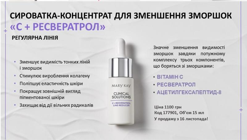 Клінічно доведено, що вітамін С зменшує видимість вікових ліній та зморшок.Ресвератрол - 0,1%