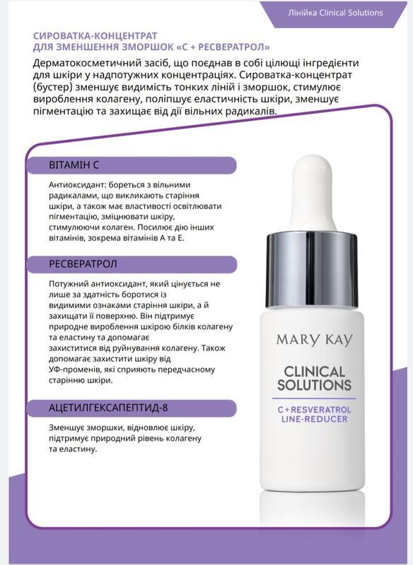 Також не можна змішувати бустер із сироваткою чи зволожувальним кремом. Нанесення має бути послідовним.Ключові інгредієнти бустера Clinical Solutions™ "С+ресвератрол"