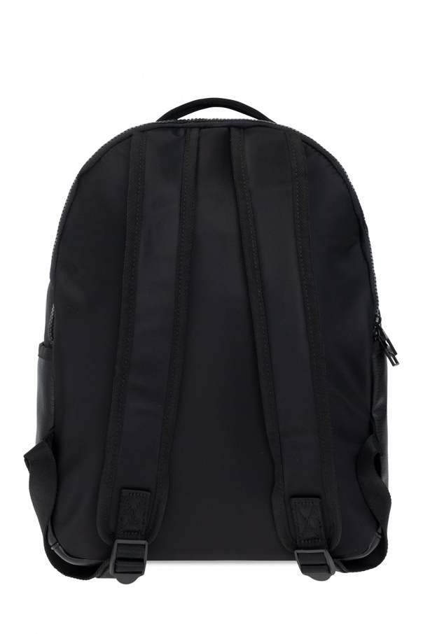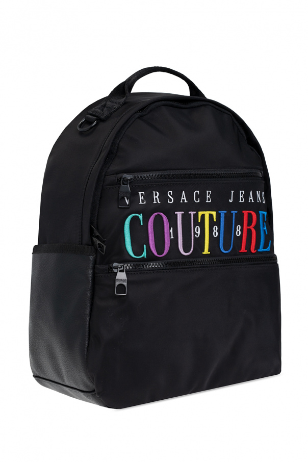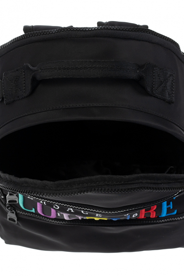 Black backpack from Versace Jeans Couture. Embellished with colourful logo embroidery, this design features a two-way zip fastening, two zipped pockets on the front, two slip pockets on the sides, a back compartment with a two-way zipper and a slip pocket inside, adjustable shoulder straps, a half-round top handle, and a main internal compartment with two slip pockets and one zipped pocket.