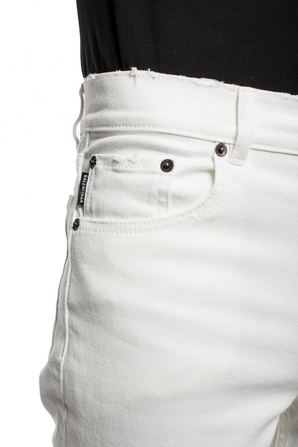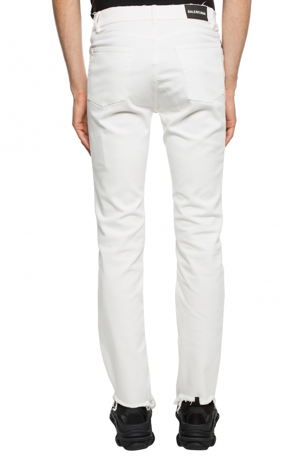 White raw-edge jeans from Balenciaga featuring zip fly and top button fastening as well as 4 slip pockets and straight legs.